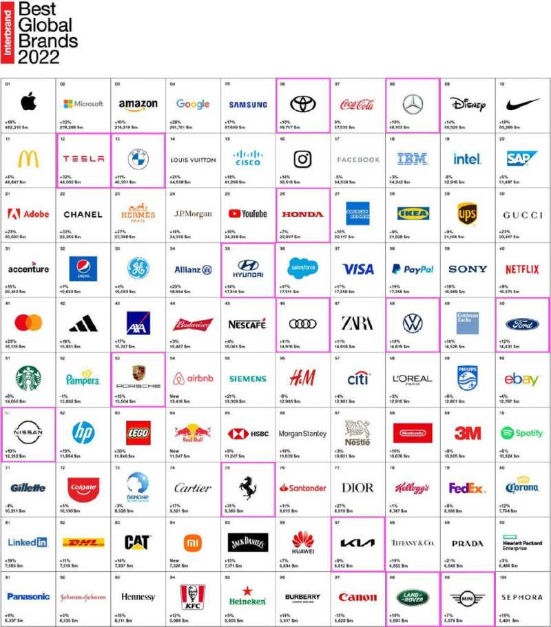 近日,小编从相关渠道了解到,全国知名的品牌咨询公司Interbrand正式公布了2022年最佳全球品牌排名,此次公布的榜单并非是单一某一行业领域的品牌榜单,而是涵盖了手机、互联网、餐饮、汽车、奢侈品、软件开发等各行各业的品牌。