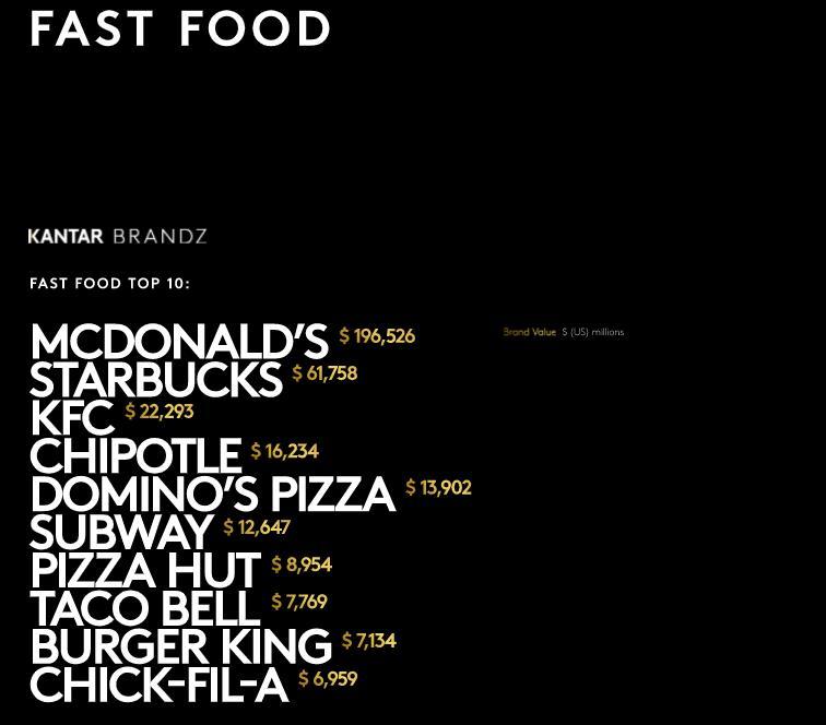 快餐类,麦当劳1965亿美元一家独大,甩出追赶者几条街。