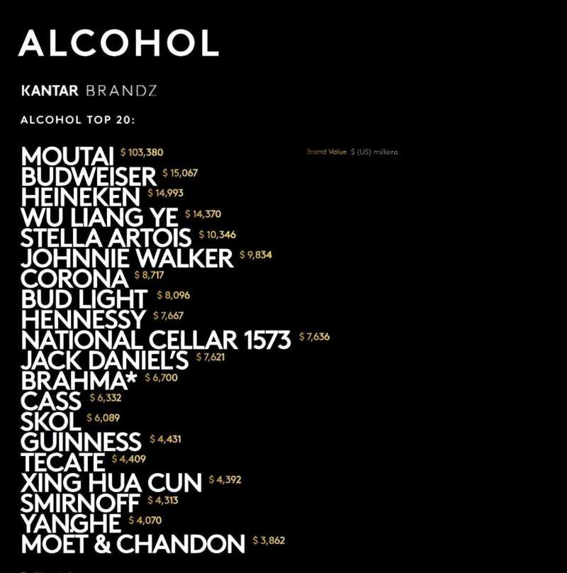酒类子榜单中,茅台以巨大优势排在榜首,1033.80亿美元的品牌价值甚至相当于排名2-11位百威、喜力、五粮液、时代、尊尼获加、科罗娜、百威昕蓝、轩尼诗、国窖1573、杰克丹尼的总和,可谓笑傲江湖。