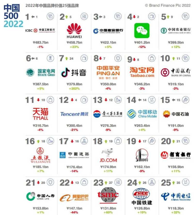 英国品牌评估机构“品牌金融”(Brand Finance)发布《2022中国品牌价值500强》榜单,品牌总价值达到人民币133108亿元。工商银行蝉联中国最有价值的品牌。品牌价值前十大品牌还有:华为、建行、微信、农行、国家电网、抖音、中国平安、淘宝和中国银行。