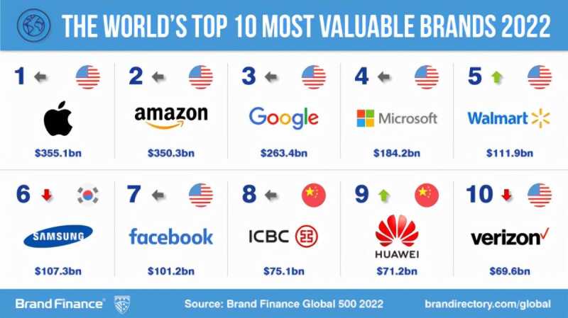 2022年全球品牌价值TOP500排名:苹果第一,中国两家企业跻身前十