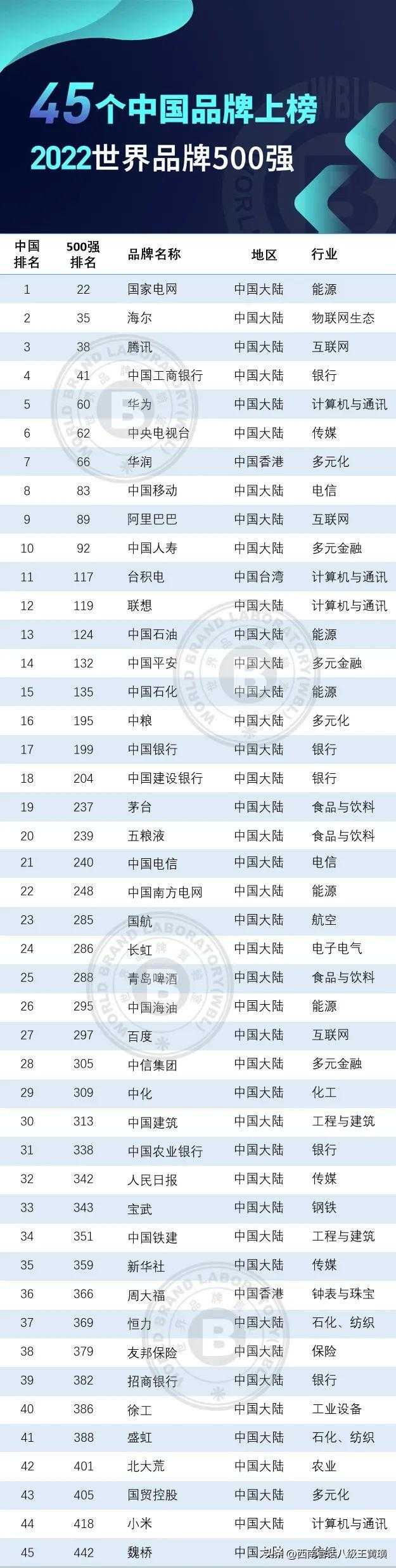 2022《世界品牌500强》发布,45个中国品牌上榜。华为仅排第五