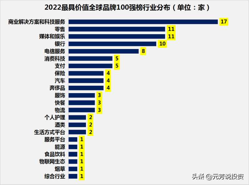 从行业分布来看,2022最具价值全球品牌100强分布月22个行业。其中商业解决方案和科技服务有17个品牌上榜,上榜品牌数量居所有行业第一;媒体和娱乐与零售行业均有11个品牌入围,上榜品牌数量并列行业第二;银行有10个品牌品牌上榜,位居行业第三。