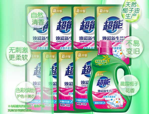 超能隶属于浙江纳爱斯集团,公司成立于1968年,在市场上知名度相当高,旗下的洗衣液都采用再生天然油脂为原料,可以说是真正意义上纯天然的产品。超能双离子洗衣液采用天然椰子油生产,藴含椰油皂基,对织物肌肤温和更安全,低泡易漂,更加适合机洗。产品还采用优化双活性离子,能够深入纤维祛除袖口、领口、衣角等多处顽固污渍,清雅的百合花香,自然清爽。