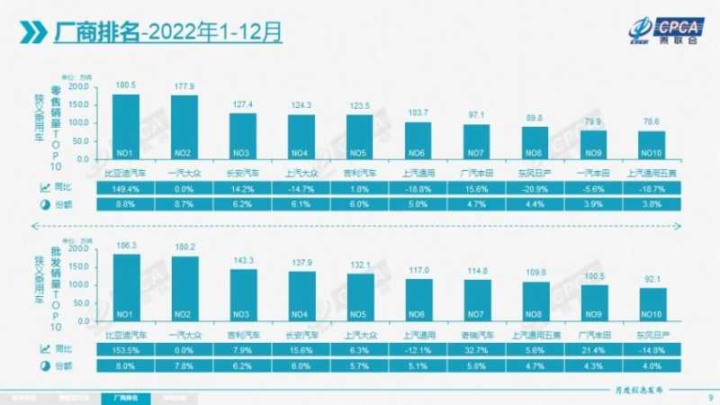 不过,各家车企公布的销售数据往往有所区别。例如长城的数据包含出口,日产的数据会包含商用车。所以,我们统一借鉴乘联会公布的国内乘用车批发数据,来看看各家车企,在2022年销量到底如何?