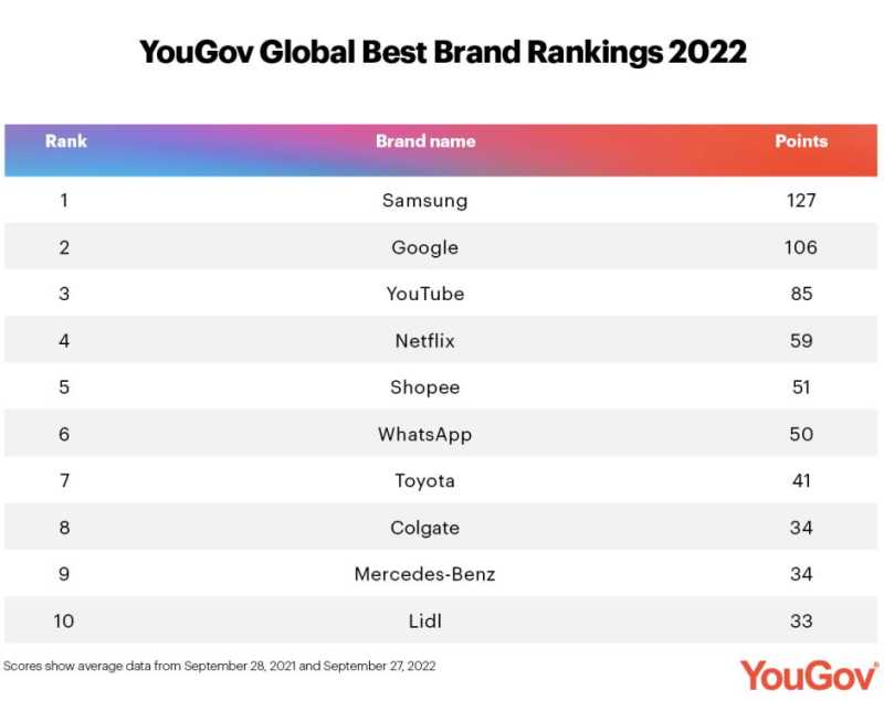 外媒发布2022全球最佳品牌榜:三星全球登顶
