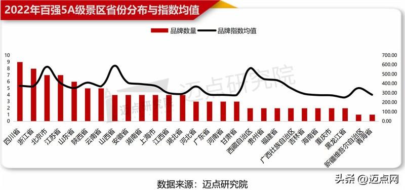 从省份角度来看,榜单前五分别为:四川省、浙江省、北京市、江苏省、山东省。四川省全省5A级数量16家,位列全国第四,2022年5A级景区百强榜四川省上榜9家,位居榜首,成绩不俗。近年来,四川省的A级景区发展势头喜人,在保护传承世界遗产的过程中再开新局。乐山大佛等景区也不断扩容提质,积极打造智慧景区,为打造国家级旅游品牌助力。从品牌指数均值来看,山西省(589.61 )、北京市(578.39 )、西藏自治区(563.07 )排名前三,主要得益于故宫博物院、黄河壶口瀑布旅游区、拉萨布达拉宫景区等头部5A级景区的加持。