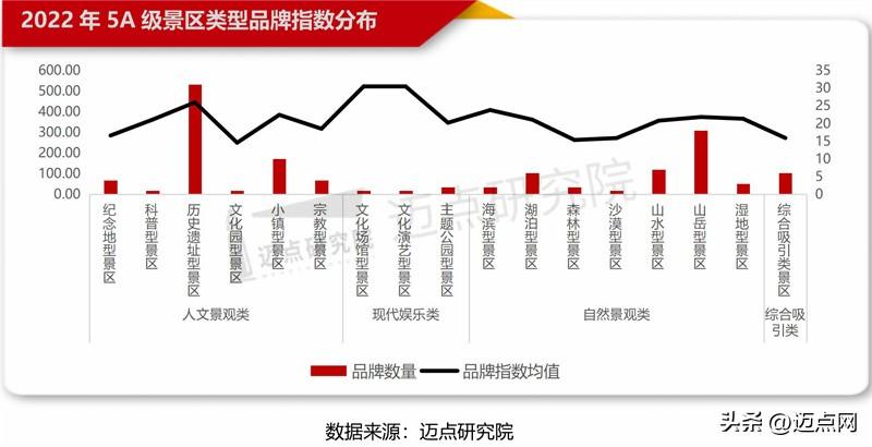 从5A级景区类型分布来看,5A级景区百强榜单中,人文景观类、自然景观类依旧稳居冠亚军,分别上榜51和39个5A级景区;细分类型中,以历史遗址型景区、山岳型景区、小镇型景区为主,分别占据31、18、10个席位。从品牌指数来看,2022年5A级景区各类型中品牌指数由高到低分别为:现代娱乐类景区(463.22 )、自然景观类景区(343.06 )、人文景观类景区(340.49 )、综合吸引类景区(272.46 )。细分类型品牌指数由高到低分别为:文化场馆型景区(522.07 )、文化演艺型景区(521.21 )、历史遗址型景区(444.89 )。