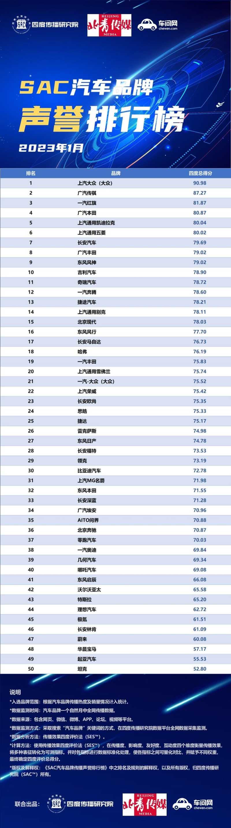 2月9日,四度传播研究院(SAC™)联合北青传媒、车问网,正式发布了2023年1月份共50个汽车品牌的声誉排行榜。从本月的汽车品牌声誉排行榜来看,上汽大众(大众)品牌继前两个月获得第一之后,2023年开年首月再度获得第一,广汽传祺和一汽红旗则分列第二、三名。此外,上月垫底的起亚汽车,本月排名上升一位,倒数第一则交给了坦克品牌。