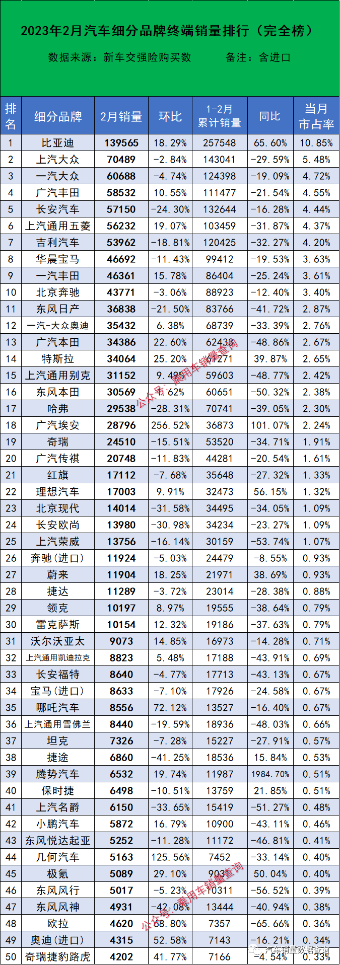 2月品牌销量榜出炉,共175个品牌,你的爱车品牌排第几?