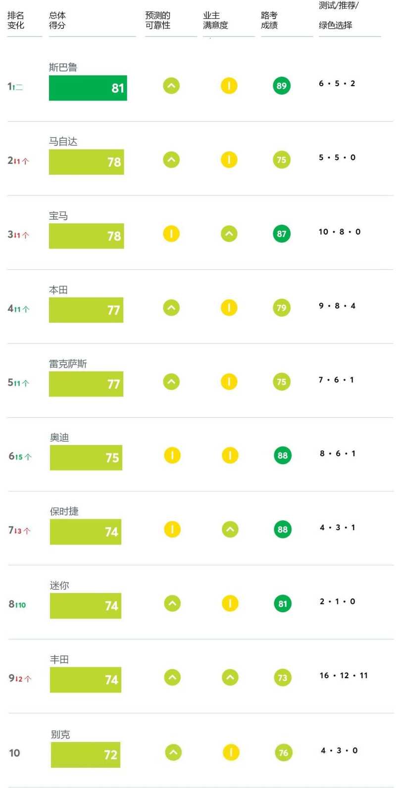 第四名是本田汽车,本田汽车的表现有点高于预期,得分更是超过了丰田汽车,路试成绩也是领先丰田。第三名是宝马汽车,宝马汽车的排名下滑了一位,它的得分与马自达相同,但在推荐车型方面稍逊一筹。第二名是马自达汽车,综合得分为78分,路试成绩表现一般,只得到了75分,第一名是斯巴鲁汽车,综合得分超过了80分,车主满意度和路试成绩都很出色,而且还有两款车型获得了绿色推荐。