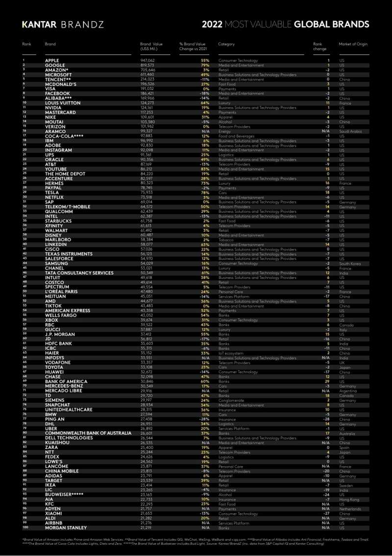 2022 BrandZ最具价值全球品牌揭晓:苹果夺冠,腾讯阿里位列前十