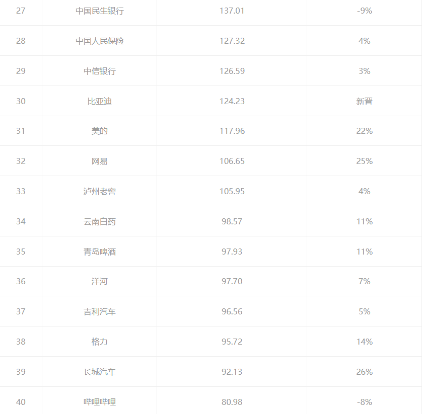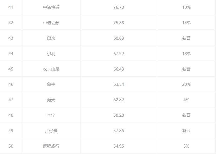 2022年Interbrand中国品牌榜共计有5个新晋品牌,分别是比亚迪 (30) 、来 (43) 、农夫山泉(45)、李宁 (48) 、片仔 (49) ,主要集中于新能源汽车,消费品以及医疗行业。