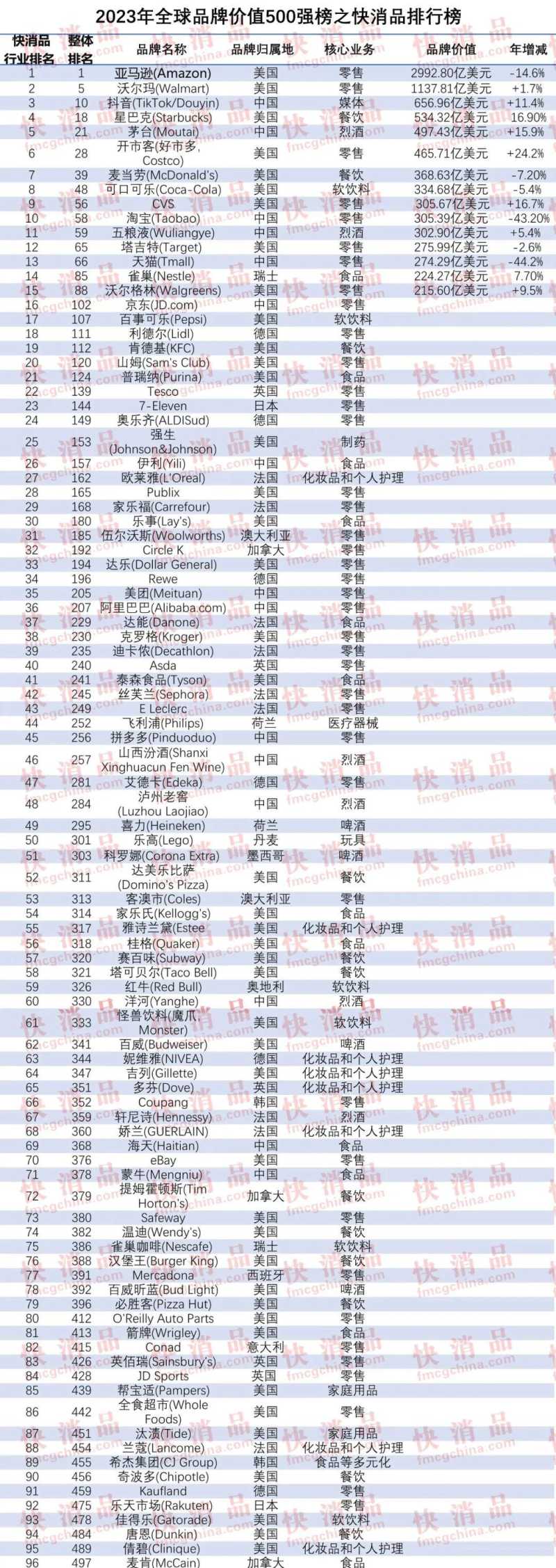 【数据】2023年全球品牌价值500强榜单公布!96个大快消品牌入榜