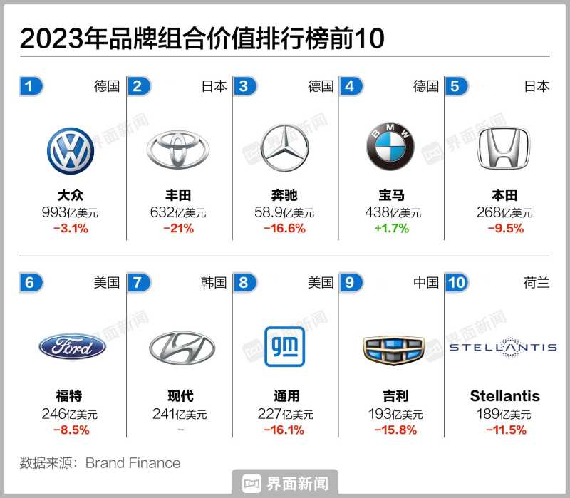 2022年曾排名第10名的日产,受困于供应链、疫情和电动化转型等问题,该集团今年跌出本次榜单前10。