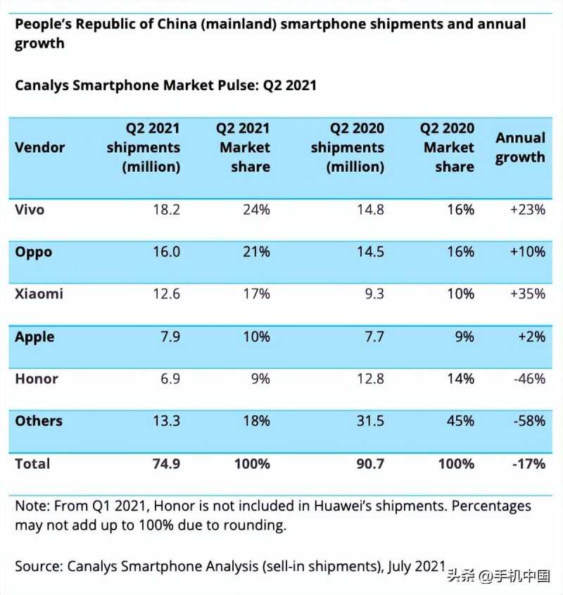 Canalys数据显示,2021年第二季度,国内手机厂商出货量前五分别为:vivo(1820万台)、OPPO(1600万台)、小米(1260万台)、苹果(790万台)和荣耀(690万台),份额占比分别为24%、21%、17%、10%以及9%。
