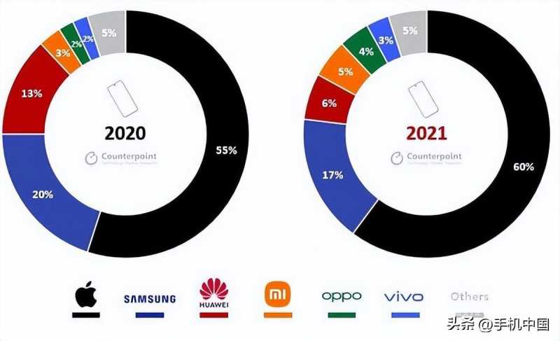 Counterpoint此前发布的数据显示,2020年,在高端手机(大于400美元)市场,苹果占据了55%的市场份额;其次是三星,占比20%;华为第三,占比13%。小米、OPPO、vivo市场占比加起来约为7%。