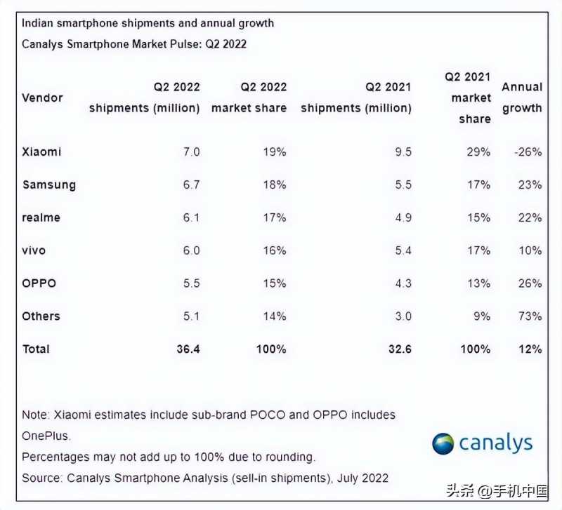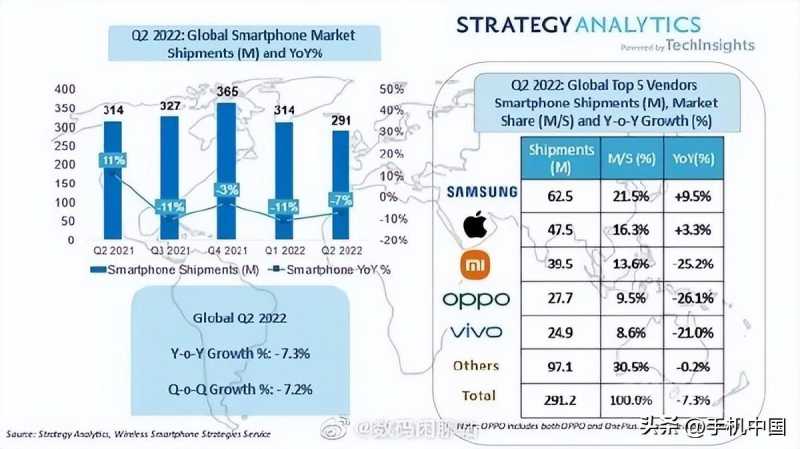 Strategy Analytics发布的数据显示,2022年第二季度,三星全球手机出货量为6250万,排名第一;苹果出货量为4750万,排名第二;小米出货量3950万,份额占比13.6%,位列第三;OPPO出货量2770万,超过了vivo排名第四;vivo出货量2490万,排名第五。小米在海外市场的表现要优于OPPO,更要优于vivo。