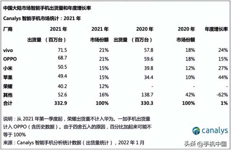 2020年11月,华为正式对外宣布出售荣耀。对于交割后的荣耀,华为不再占有任何股份。与华为完全分离后的荣耀,不再受到美国制裁限制,市场份额也逐渐迎来上扬。2021年全年,荣耀出货量达4020万台,市占比为12%,排名第五。