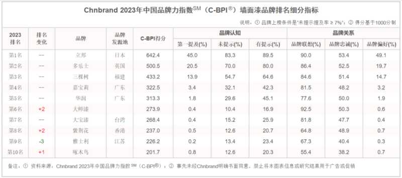 4月18日,中国领先的品牌评级与品牌顾问机构Chnbrand发布2023年(第十三届)中国品牌力指数(C-BPI)品牌排名和分析报告。该指数自2011年首次推出后,连续数年获得工业和信息化部品牌政策专项资金的扶持。涂界记者注意到,立邦、多乐士、三棵树、嘉宝莉、华润、大宝漆、紫荆花、大师漆等知名涂料品牌上榜。
