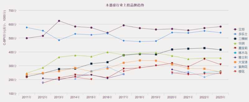 2022年中国品牌力指数木器漆(油漆)品牌排行榜显示,立邦、多乐士、三棵树、华润、嘉宝莉、啄木鸟、雅士利、大宝漆、紫荆花、樱花分别排名第1-10位,C-BPI得分分别为582.1、537.9、414.7、354.5、307.5、258.7、258.4、254.0、251.5、242.5。