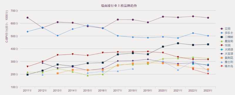 2023年中国品牌力指数墙面漆品牌排行榜显示,立邦、多乐士、三棵树、嘉宝莉、华润、大师漆、大宝漆、紫荆花、雅士利、啄木鸟分别排名第1-10位,C-BPI得分分别为642.4、500.5、433.2、322.5、313.3、273.9、268.4、237.0、226.2、201.7。