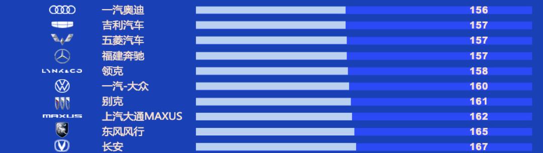 一汽奥迪、吉利汽车、五菱汽车、福建奔驰和领克汽车的质量排行分数都低于160,奥迪汽车和吉利汽车的排名比较靠前,也是挺令人认可的,毕竟它们都是主流品牌,吉利年销量在百万辆以上,奥迪也是消费者最喜欢的三大豪华车品牌之一。一汽大众、别克汽车、上汽大通、东风风行和长安汽车也是入榜前20位,虽然一汽大众未能入榜前十五位,但它的排名较上期相比有很大提升。长安汽车排名第20位,品控表现也上达到了主流水准。