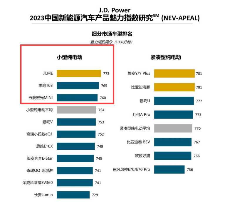 近日,J.D. Power发布了新能源汽车产品指数研究报告,该报告中涵盖了6大汽车细分市场的榜单排名,本文重点来看一下纯电动汽车方面的细分榜单(榜单数据截图见文末)的情况,五菱宏光MINI仅排第3!