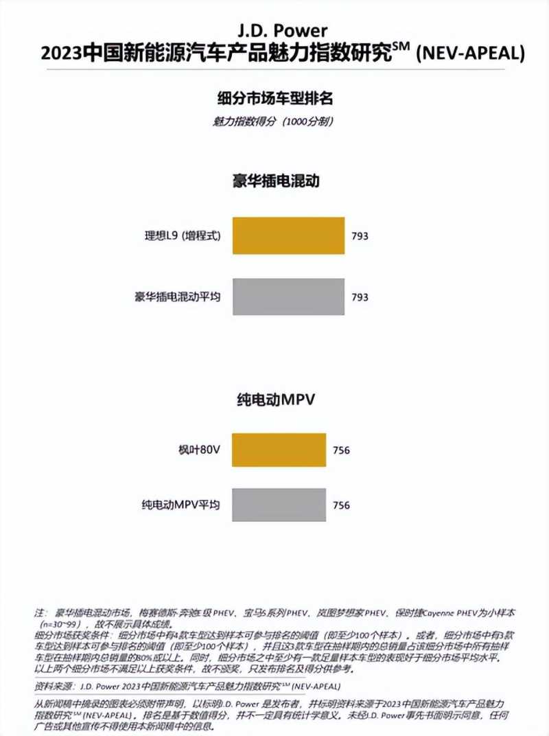 共有来自六个细分市场的七款车型在2023年中国新能源汽车产品魅力指数研究(NEV-APEAL)中摘得奖项。豪华插电混动及纯电动MPV细分市场因为不满足细分市场颁奖条件,因而没有奖项颁出。获得所在细分市场奖项的车型有: