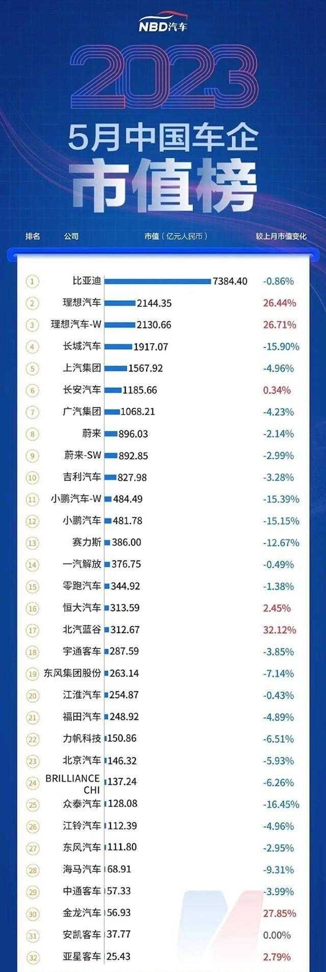 中国车企市值榜揭晓,竞争激烈,理想汽车崭露头角