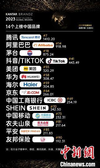 在今年的百强品牌榜上,有14家中国企业上榜,包括腾讯、阿里巴巴、茅台、抖音/TikTok、美团、华为、海尔、京东、中国工商银行等。其中,腾讯进入全球十强,农夫山泉和跨境电商巨头希音首次入围,海尔品牌排名提升。
