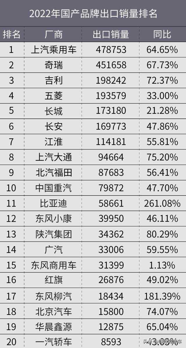看到最后可能很多人肯定都以为第一名一定非比亚迪莫属,毕竟比亚迪在国内卖的实在太火了,但是非常遗憾,在出国争光这件事情上面,比亚迪确实还有很长的路要走,比亚迪不仅没有排进前五,去年5.8万辆的出口量,连自主车企出口排名前十都未进。