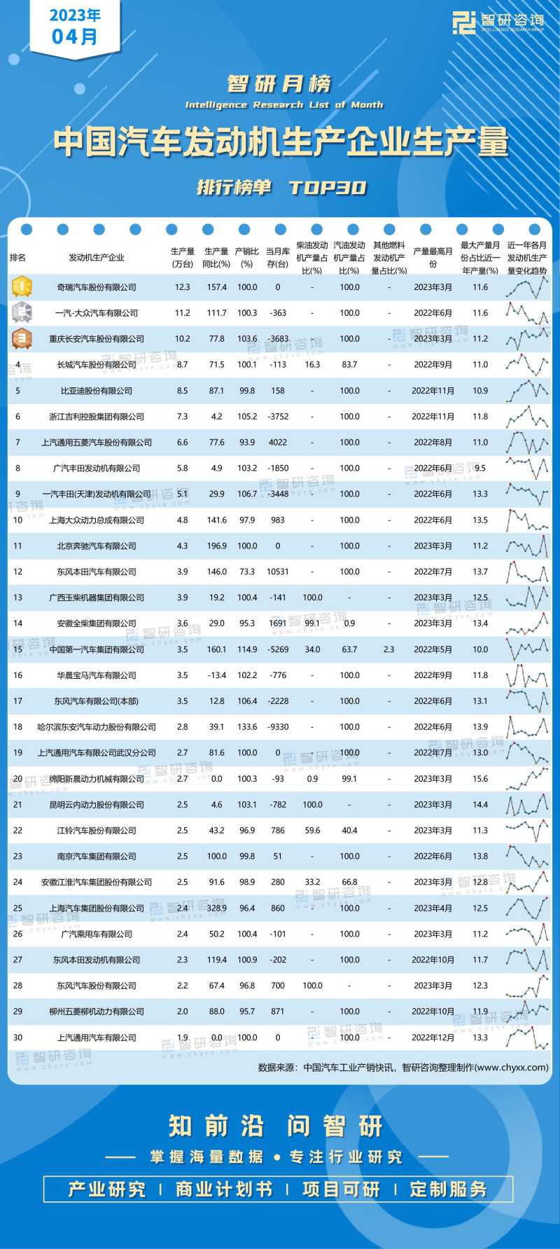 2023年4月中国汽车发动机生产企业生产量排行榜单TOP30