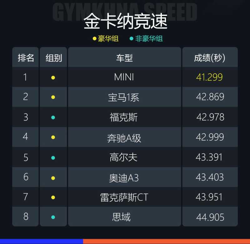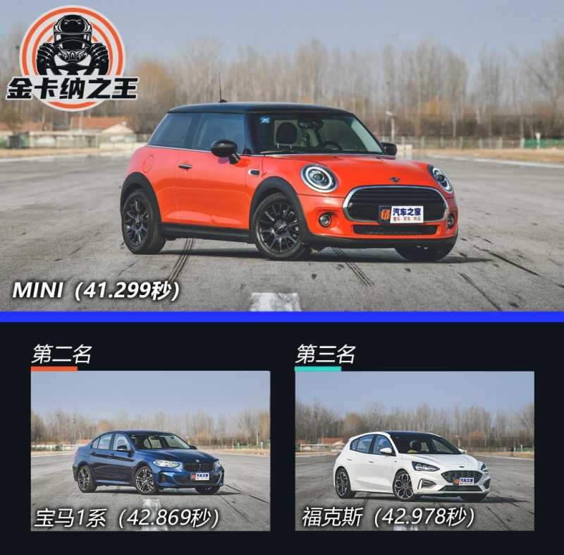 金卡纳之王:MINI获得冠军!小巧的尺寸和机械手刹(如果可以灵活使用的话),让它在这个项目中称王;宝马动力衔接优秀,悬架支撑到位;福克斯轮胎抓地力最好,在紧急变线和高速绕桩项目中表现突出,以微弱的劣势获第三。