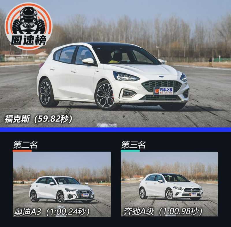 圈速榜:福克斯!黑马!你一定没想到福克斯竟然是赛道冠军,它还是全场唯一一个跑进1分钟的车型,好轮胎和出色的底盘是其取胜的关键。奥迪A3底盘紧致,变速箱逻辑运动且车身稳定系统可以完全关闭,在多弯路段响应更直接;奔驰虽然没有特别抢眼的地方,但是胜在各项均衡。