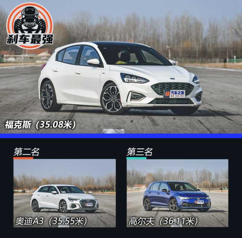刹车最强:福克斯(35.08米),轮胎好、制动力强,这两点让它拥有堪比不少性能车的刹车距离,获得这个奖项当之无愧;奥迪A3和高尔夫的刹车力释放均匀稳定,分获二、三名。