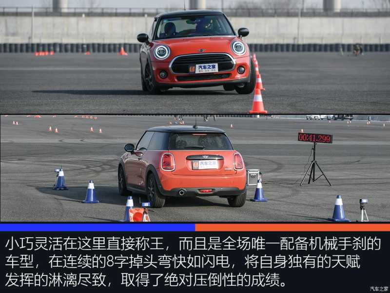 MINI是此次横评中尺寸最小的,并且配备机械手刹。在金卡纳项目中如果可以灵活运动机械手刹的话,在8字绕桩和紧急回头弯就可以赢得很多时间。1.5T动力一般,但是动力响应还不错,所以MINI赢得此项冠军毫无悬念,最终成绩41.299秒。