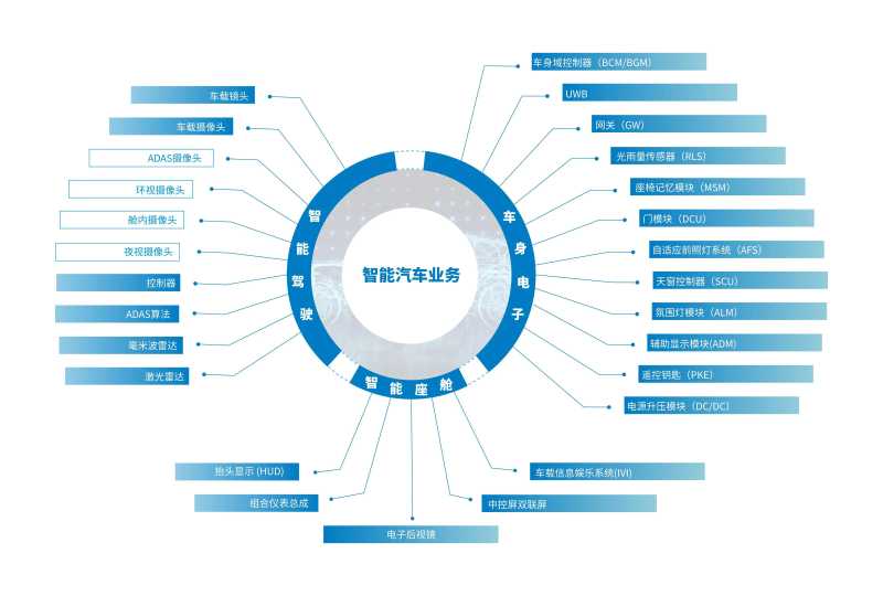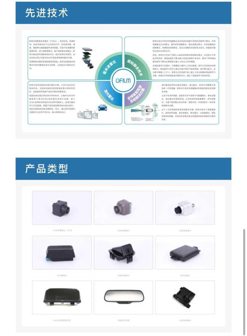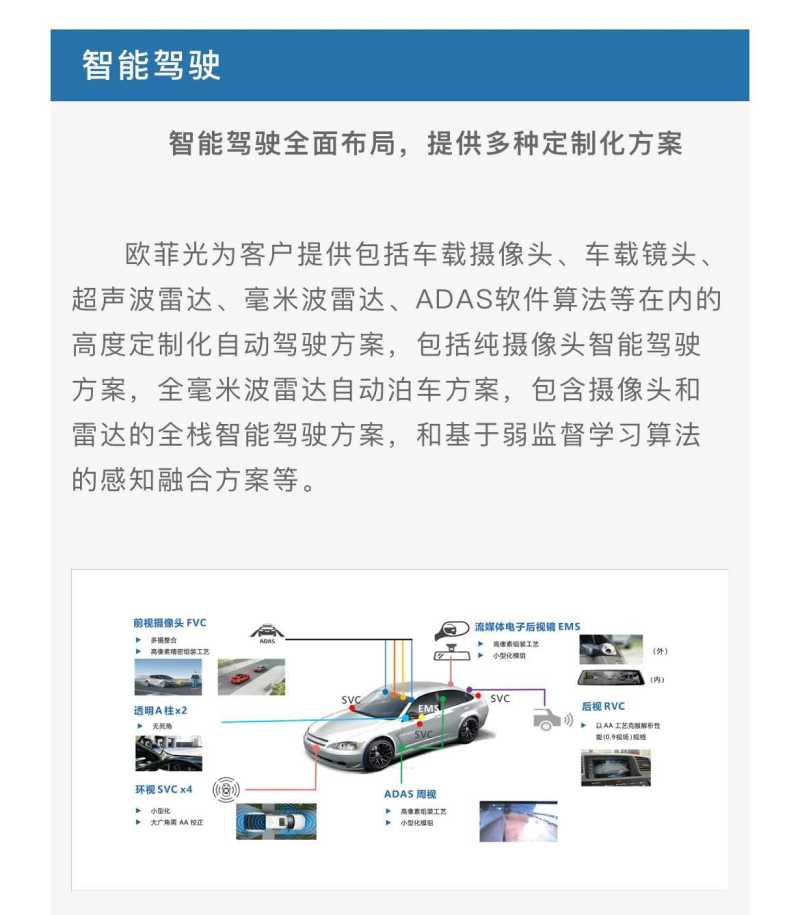 欧菲光依托在光学光电领域的技术优势,深度布局智能驾驶、车身电子和智能座舱,以光学镜头、摄像头为基础,延伸至毫米波雷达、激光雷达、抬头显示(HUD)等产品,丰富产品矩阵布局。