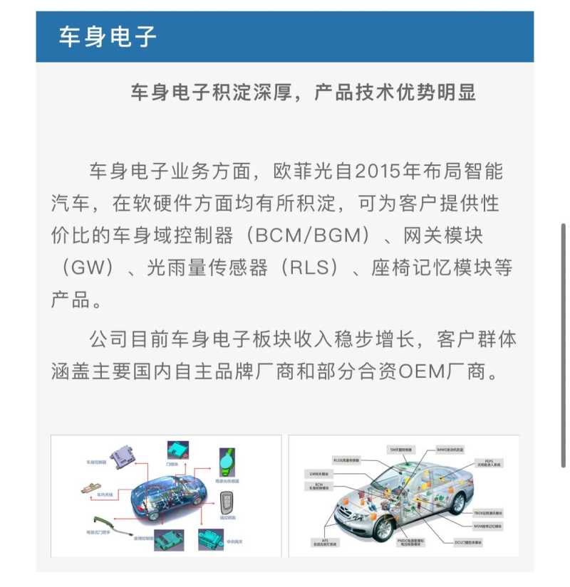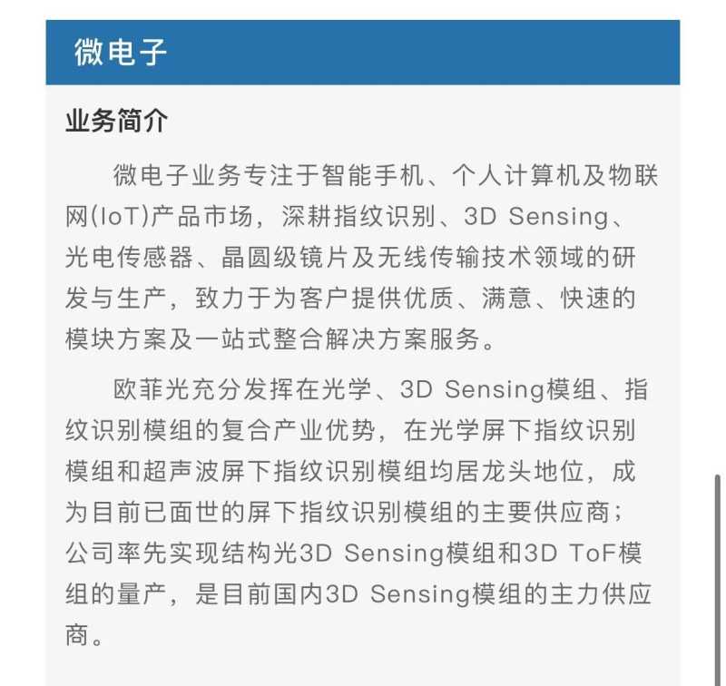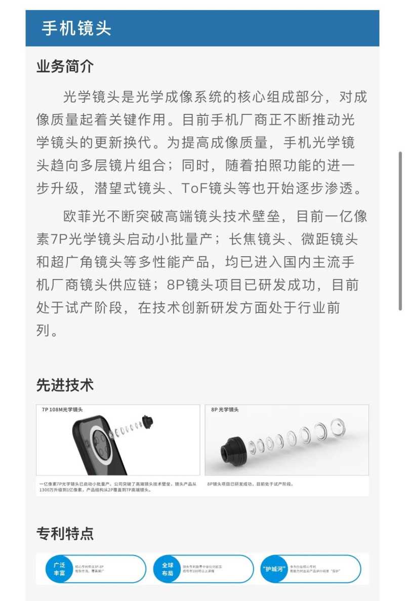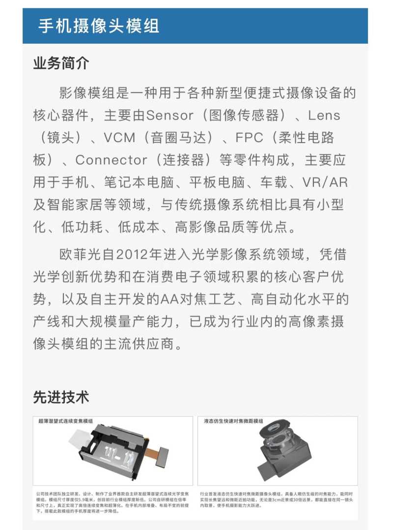 欧菲光集团股份有限公司(简称“欧菲光”)正式运营始于2002年,2010年在深交所上市,股票代码为002456。公司的主营业务为智能手机、智能汽车及新领域业务,主营业务产品包括光学影像模组、光学镜头、微电子及智能汽车相关产品等,广泛应用于以智能手机、智能家居及智能VR/AR设备等为代表的消费电子和智能汽车领域。