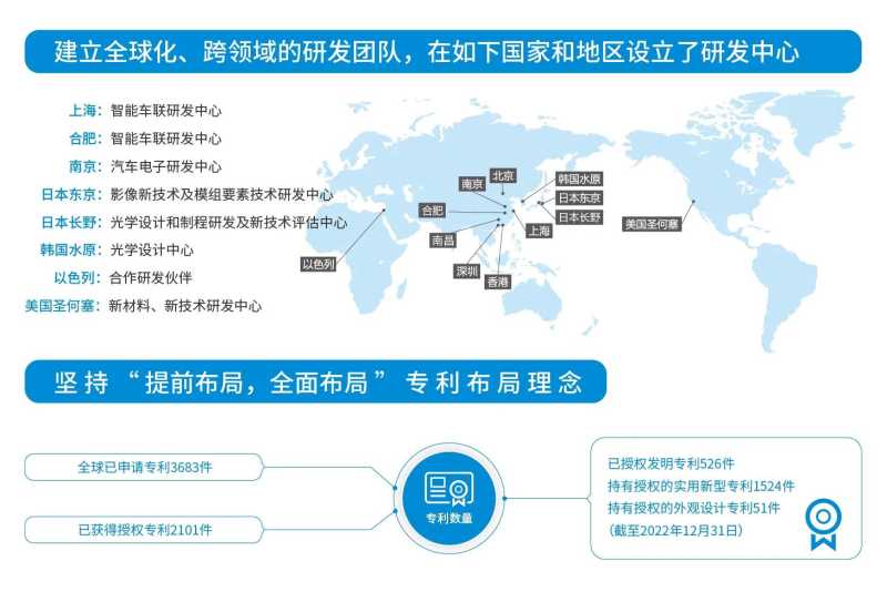 欧菲光坚持“以技术为导向、以创新为驱动”的业务模式,2022年研发投入达到16.99亿元,占营业收入比重为11.46%。在中国大陆及台湾地区、美国、日本、韩国及欧洲等地均建立了创新研发中心,建立起了全球化、跨领域的研发团队。截至2022年12月31日,公司在全球已申请专利3683件,已获得授权专利2101件。其中,已授权发明专利526件,持有授权的实用新型专利1524件,持有授权的外观设计专利51件。