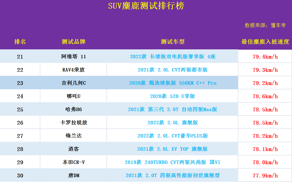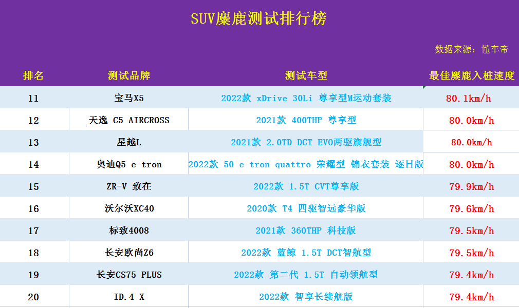 大家都清楚“麋鹿测试”是国际上衡量车辆安全性的重要标准,那么在目前SUV销售市场里,这些主流的SUV车型的安全性能究竟如何呢?根据“懂车帝的SUV麋鹿测试”前三十名的结果来看,有13款SUV车型的表现优秀,最佳麋鹿入桩速度都在80时速以上,一些车型的麋鹿成绩甚至都已经超过了跑车或性能车,“虽然SUV有底盘重心高的先天弊端,但看完这次SUV的麋鹿成绩后,谁还敢说SUV没有操控性?SUV麋鹿测试排行榜 :Model Y第5,星越L第13名,唐DM本田CR-V上榜!