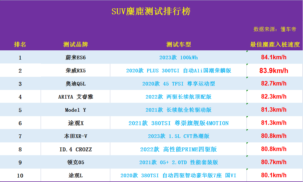 SUV麋鹿测试排行榜 :Model Y第5,星越L第13名,唐DM本田CR-V上榜