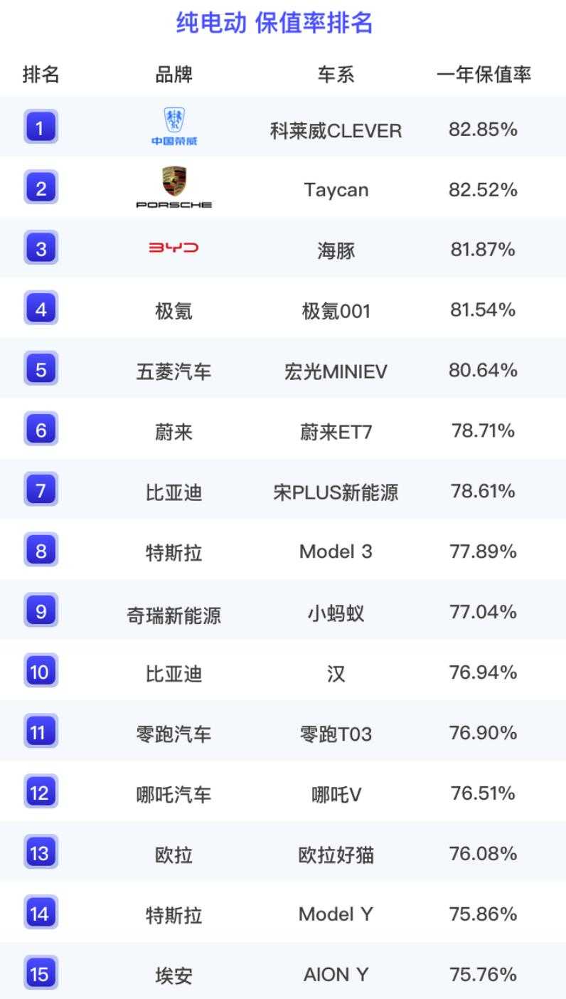 纯电动汽车别乱选!2023年保值率排名:宋PLUS第7,Model Y第14
