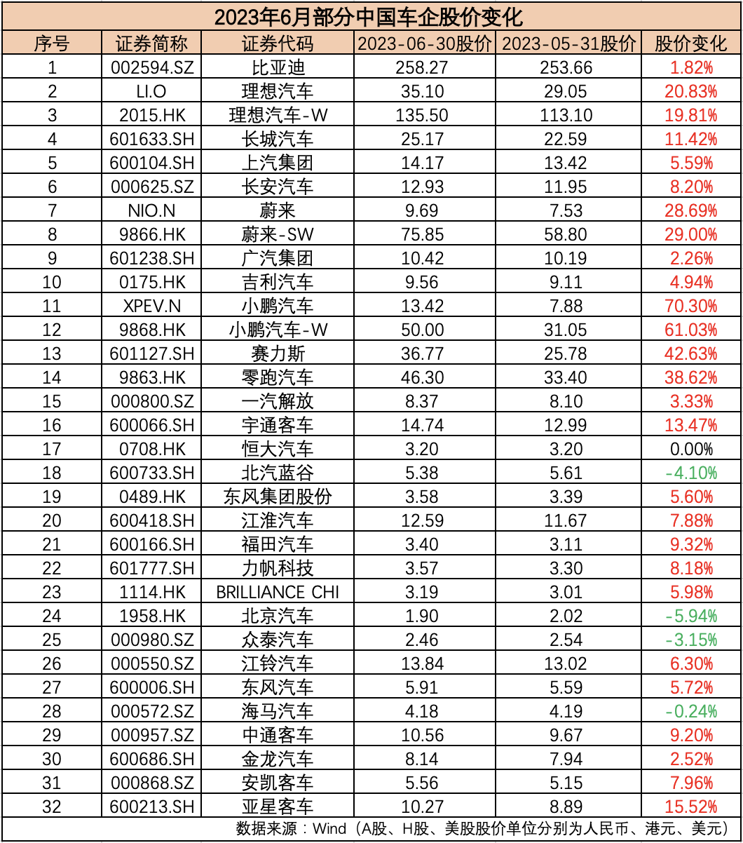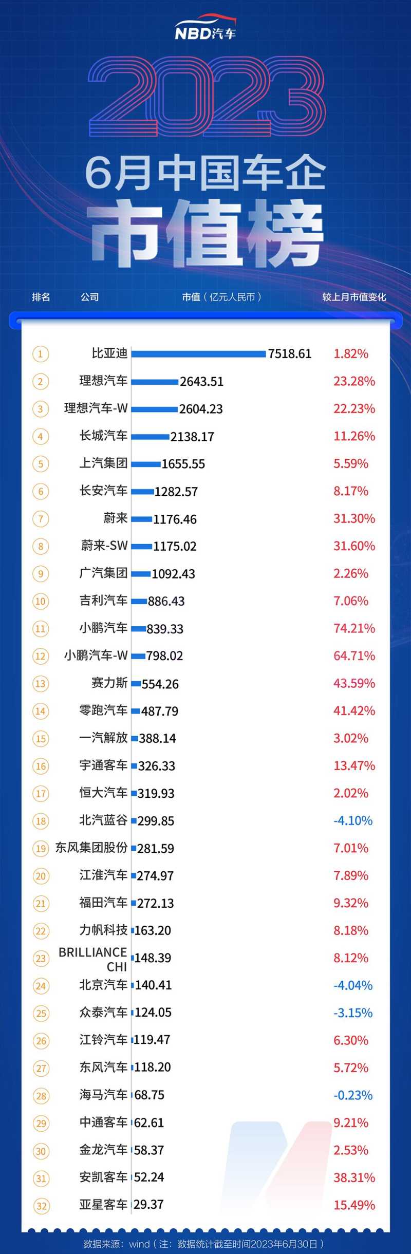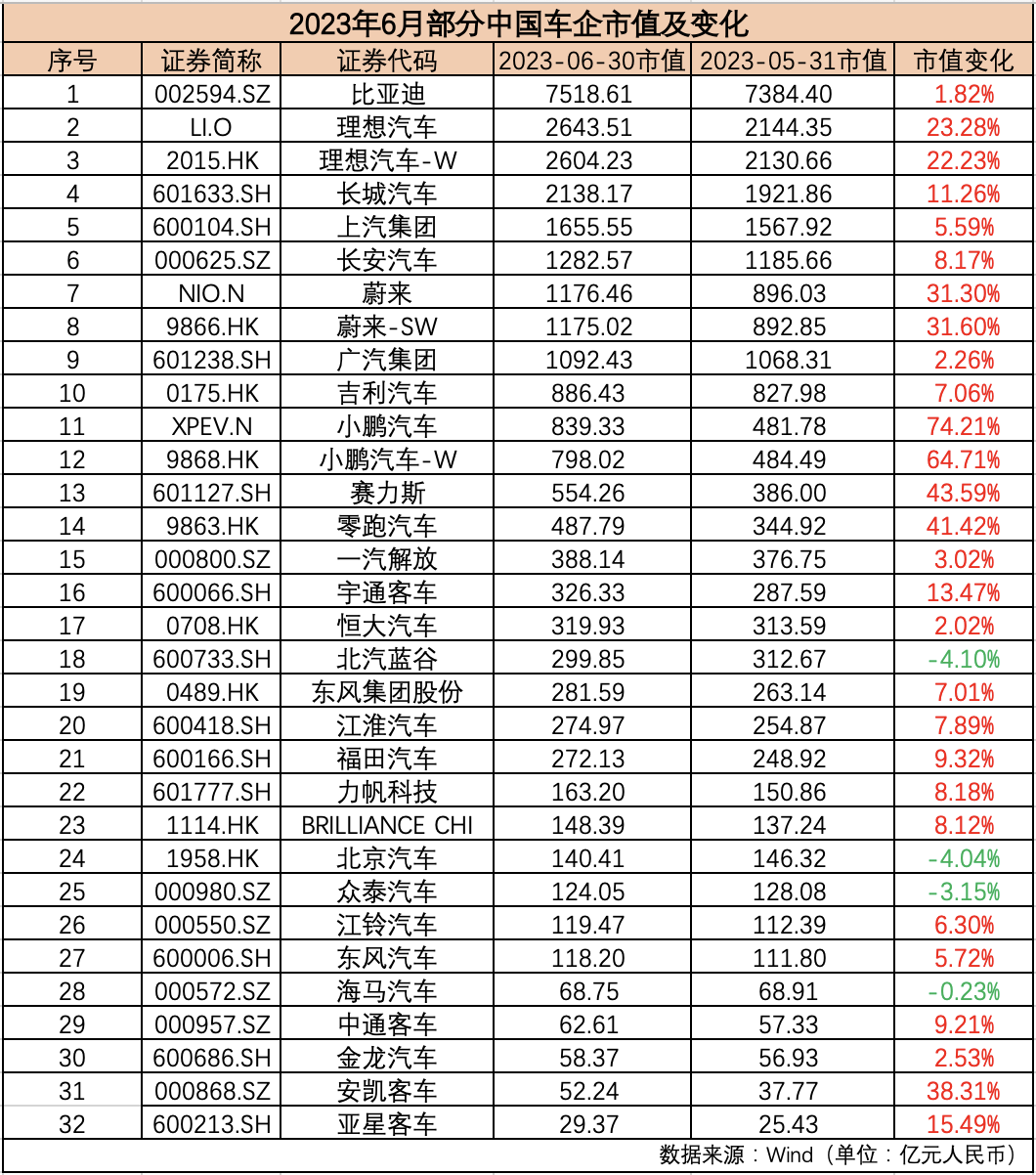 6月,在记者统计的32只国内汽车上市公司个股中,除停牌企业外,仅有4只个股出现股价环比下滑,国内整车上市公司6月市值合计环比增加了3292.58亿元,相当于两个上汽集团的市值,增幅为13.27%。