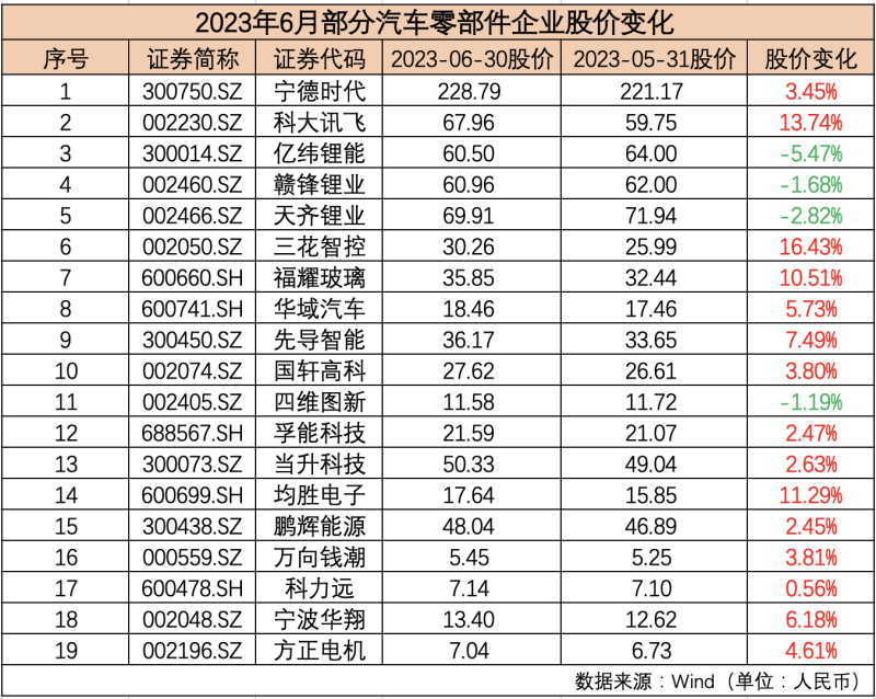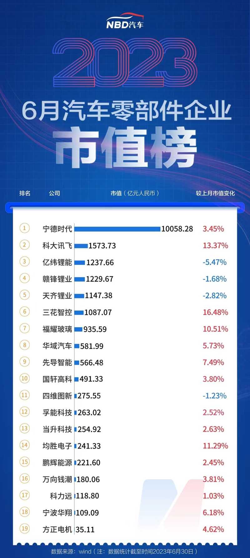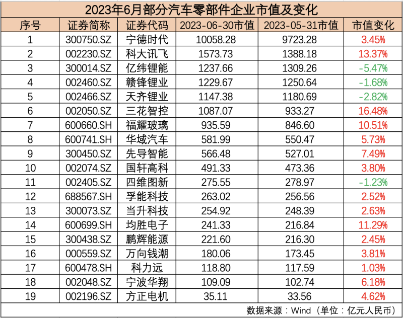 涨幅方面,三花智控、科大讯飞、均胜电子6月市值均实现了10%以上的环比增长,分比为16.48%、13.37%、11.29%。