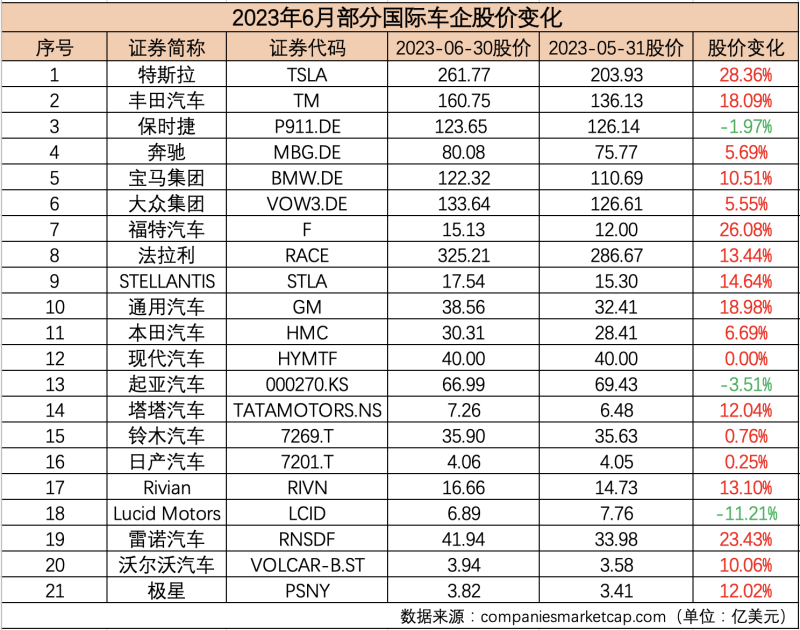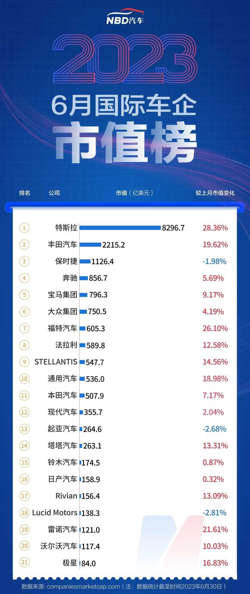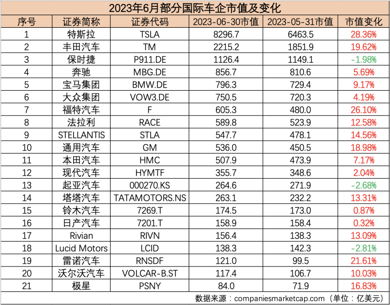 6月汽车公司市值榜丨特斯拉领衔国际板块,超八成国内车企飘红,经销商终端表现好于预期
