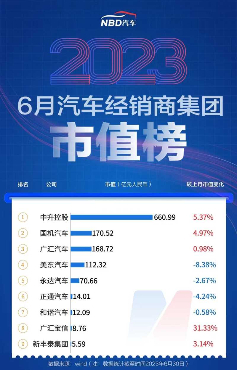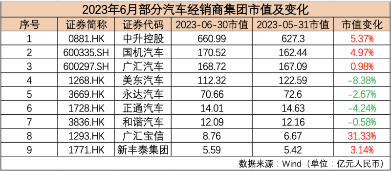 汽车经销商集团方面,国内9家汽车经销商集团中有5家实现股价上扬。记者统计的数据显示,6月,9家汽车经销商集团总体市值合计环比增加了32.76亿元,涨幅为2.75%。