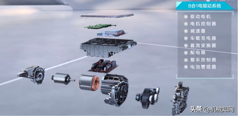 比亚迪研发的八合一高效电驱总成,是集成了驱动电机、减速器、驱动电机控制器、高低压直流转换器(DCDC)、双向车载充电器(OBC)、高压配电箱(PDU)、电池管理器(BMS)、整车控制器(VCU)八大模块,其整体性能较上一代功率密度提升20%,整机重量和体积分别降低15%、20%,系统综合效率达到89%。