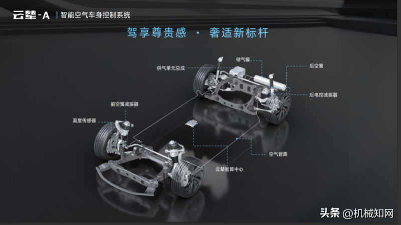 云辇-A智能空气车身控制系统(标准版)具备阻尼自适应可调功能,为用户提供多档高度可选,开发了智能化的功能模式,如随速调节、智能迎宾、载物模式、高度安全锁定等,多种功能模式拓展。