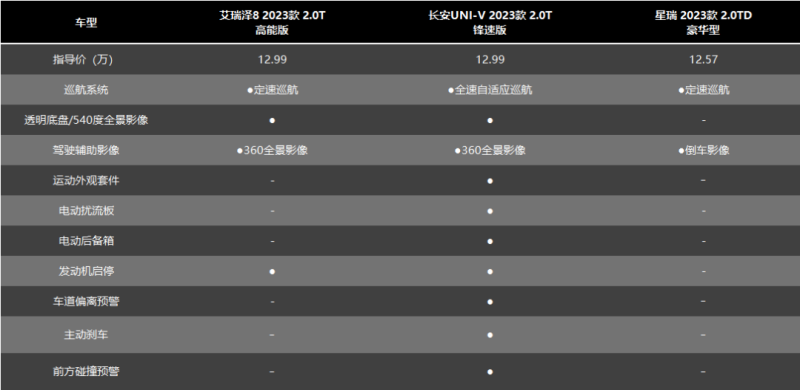 近日,奇瑞艾瑞泽8 2.0T版本车型进行上市,售价12.99-14.69万元。在同类型产品中,吉利星瑞和长安UNI-V均有2.0T车型。那么,同为运动型家轿,这三款车谁更值得购买呢?